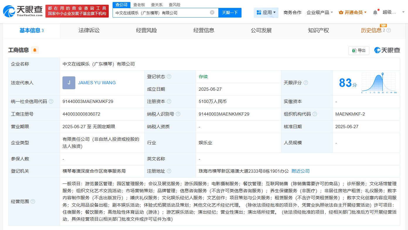 每经AI快讯,天眼查App显示,近日,中文在线(300364)娱乐(广东横琴)有限公司成立,法定代表人为JAMESYUWANG,注册资本5100万元人民币,经营范围包括游览景区管理、园区管理服务、互联网销售、组织文化艺术交流活动等。股东信息显示,该公司由广东横琴中文在线文化科技有限公司全资持股。